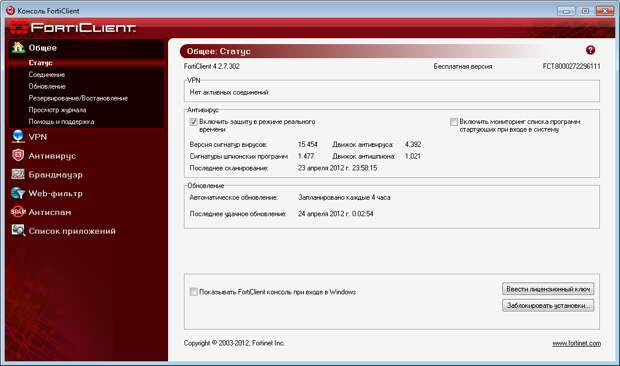 FortiClient Standard - комплексный антивирус корпоративного класса, доступный бесплатно для защиты Windows компьютеров и ноутбуков. Включает фаервол с контролем сетевого доступа программ, VPN-клиент (для IPSec и SSL), веб-фильтр и антиспам